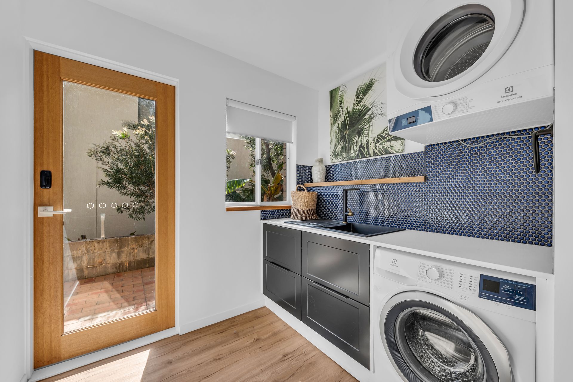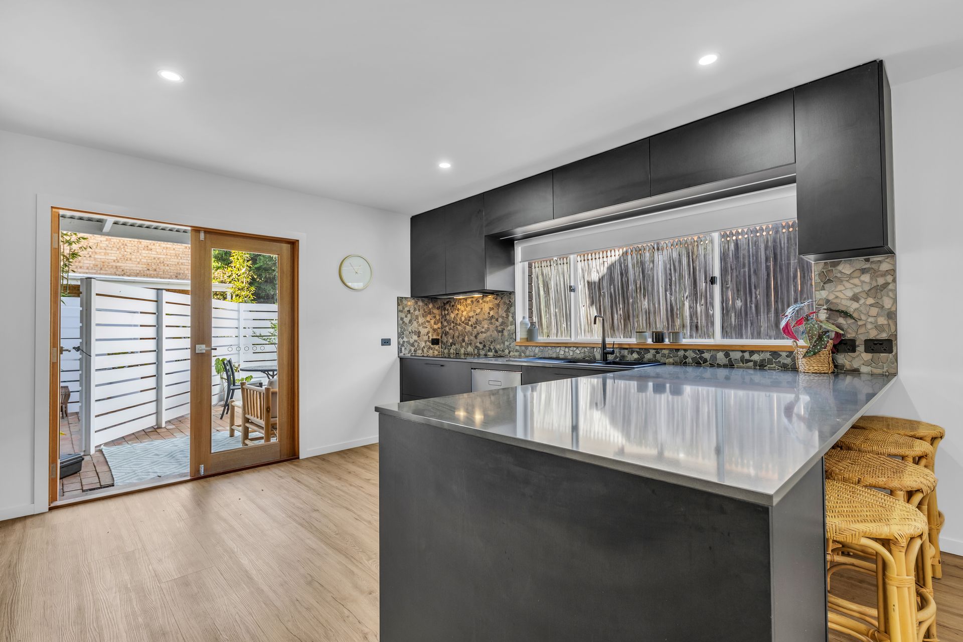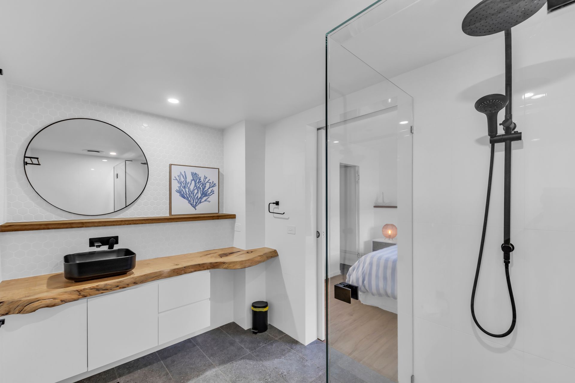 The african inspired theme includes an extra large open living area with leather lounge, large screen TV. The feature is the large ten seater natural timber slab bespoke table for your crowd to share a meal together cooked from the large chefs kitchen with caesar stone bench tops, double ovens, dishwasher and large fridge. The kitchen has double french glass doors opening out to an outdoor seating area.