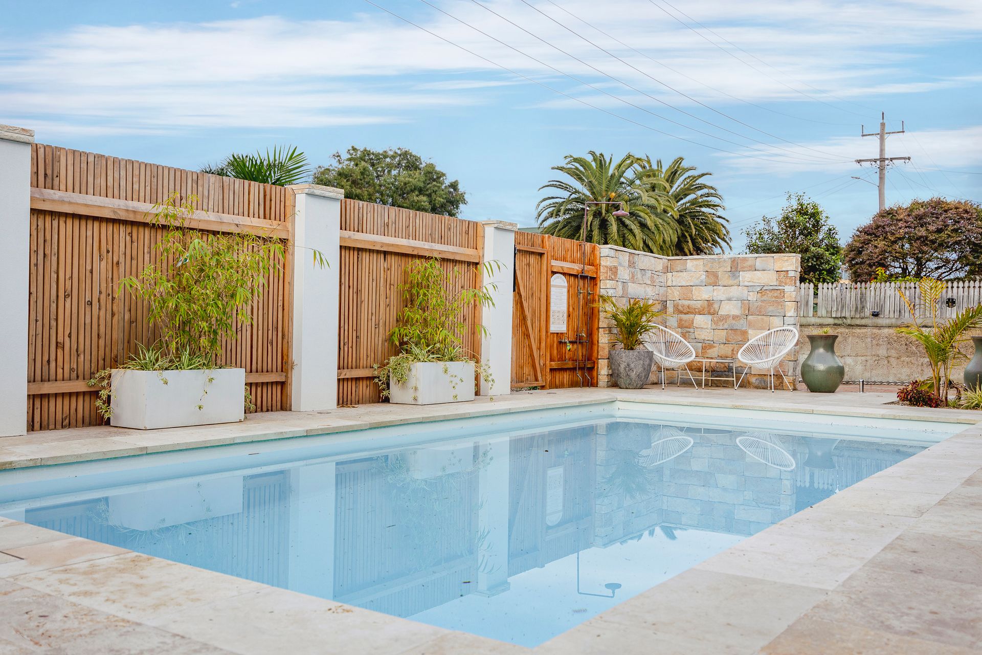 Nearby, also on the ground floor level is a Bali style hut, shared outdoor area featuring a BBQ, pizza oven, outdoor lounge and a well used pool table. Guests can also use the shared tropical pool at the front of the building, which has a hot water shower, ideal for washing off sand after a swim at the beach. There’s also an extra ground floor shared toilet in the staircase area in centre of the complex.